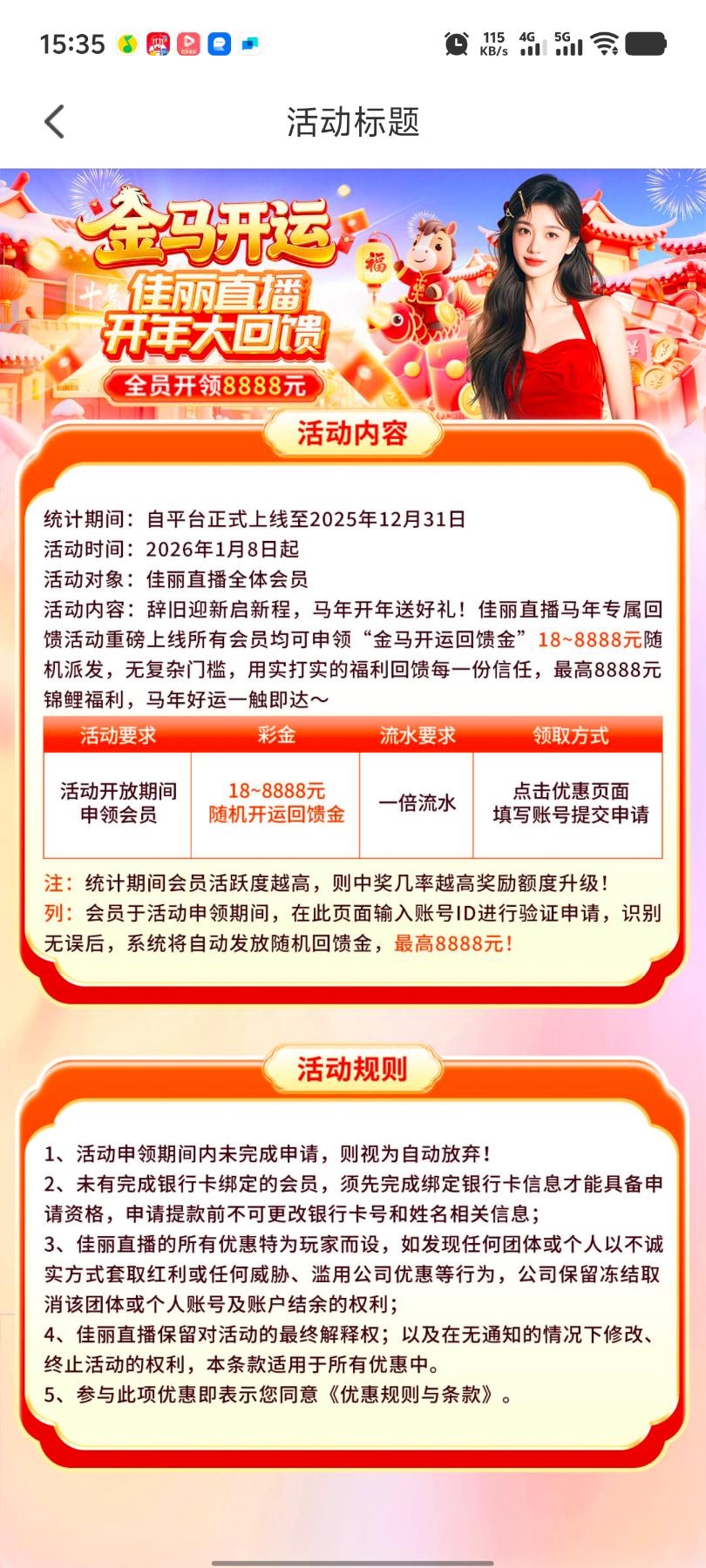 佳丽直播最低回馈18元,有号的看看,优惠里申请,我送了38没打出来
