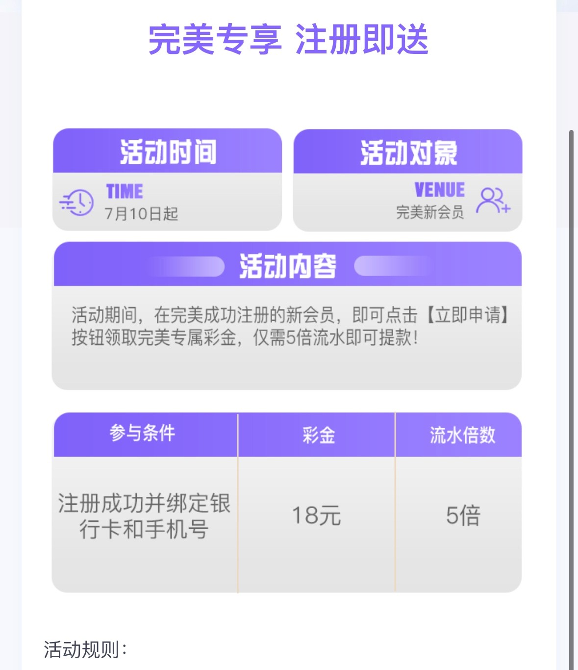 活动:新用户注册绑定手机号银行卡-优惠-新人活动自助申请18彩金,五倍流水提 最高提200 禁止充值