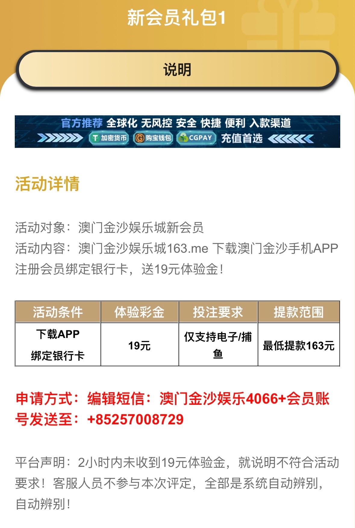 新用户下载app注册绑卡 按照要求自助发送短信领取19元彩金 这种基本都送 限制游玩电子捕鱼类游戏 最低提款163元-撸白菜全程流量搞