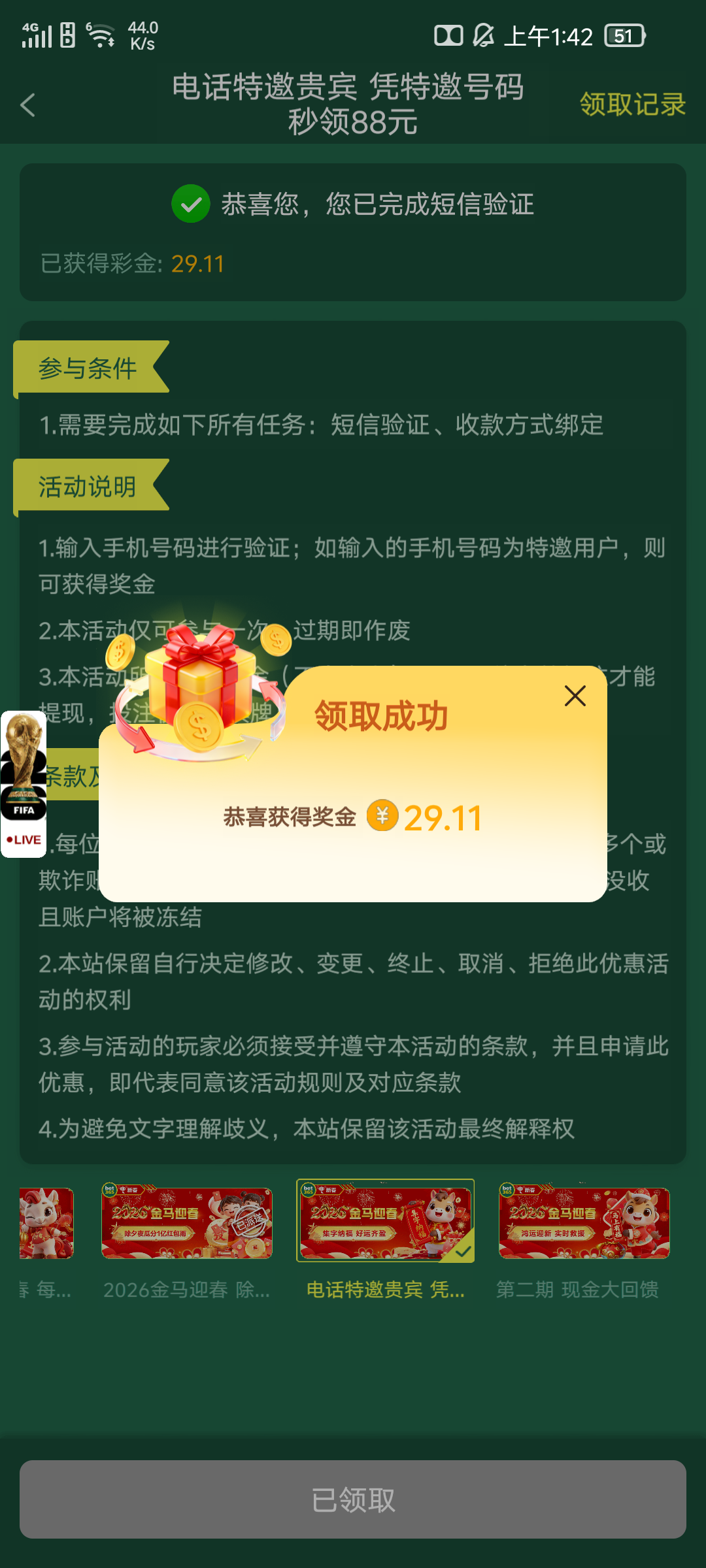 注册账号随便绑定个钱包,优惠里面下滑下拉,找到电话特邀,手机号验证自助领取28-88,基本每个号都有,出款自测!